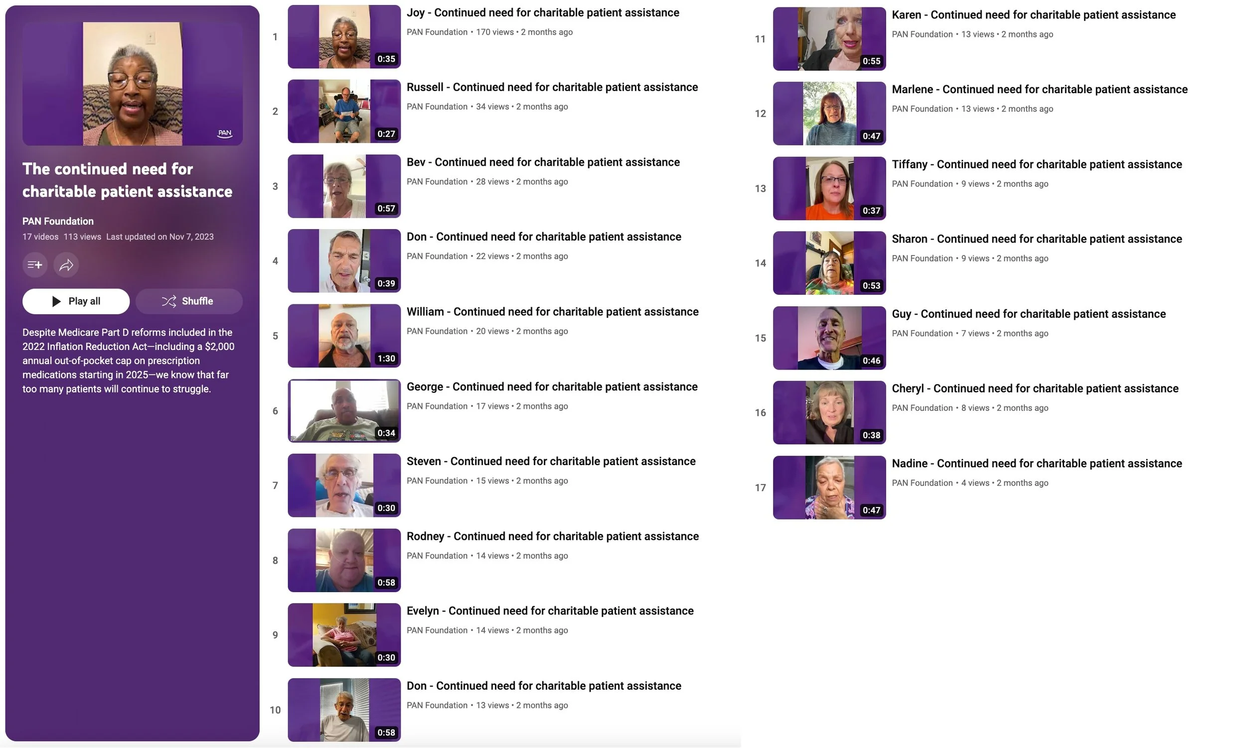 I pitched and launched a two-phase campaign. The first phase shared facts and figures emphasizing why millions of Americans still need patient assistance to the networks of relevant decision makers. The second phase collected testimonials from Medicare patients who depend on PAN to afford their life-saving medications. This user-generated content (UGC) was then promoted to target audiences as video ads across YouTube, Facebook, and LinkedIn.